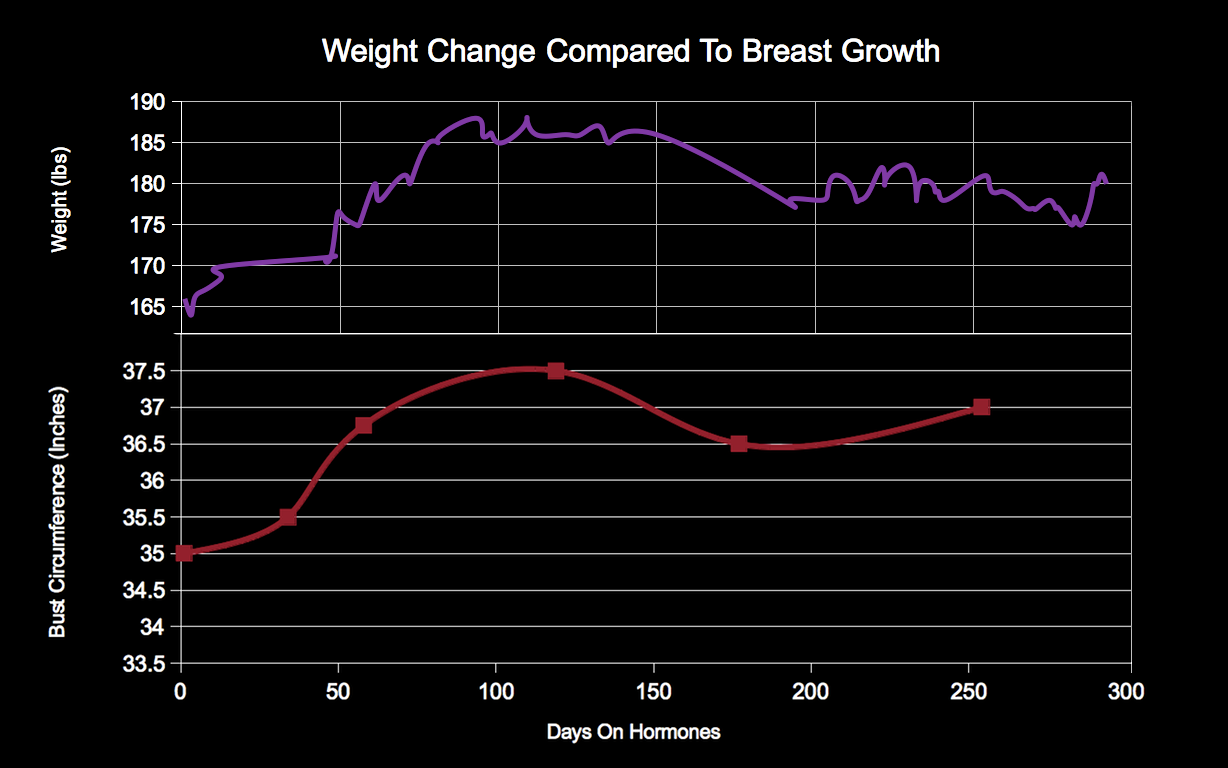 I got a little carried away and ended up photoshopping these two graphs together. It definitely paints an interesting picture of how fat effects breast size. I think as we see the chart progress the breast size will be less dependent on the amount of fat you have. You can kind of see the breast line rising while the weight stays fairly consistent, this was right around when I started back on the estrogen and then raised my dose to 2mg. Once more milk ducts form I think breast growth will become a steady rise.